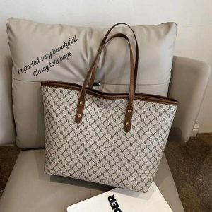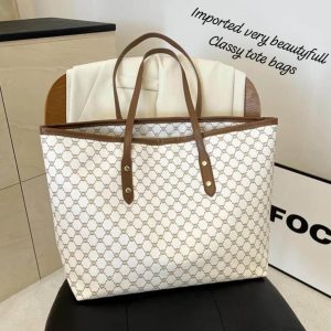 - Make a bold fashion statement with this large-sized tote bag featuring a stylish monogram print and a high-shine metal logo on the front. Its eye-catching design is sure to turn heads wherever you go