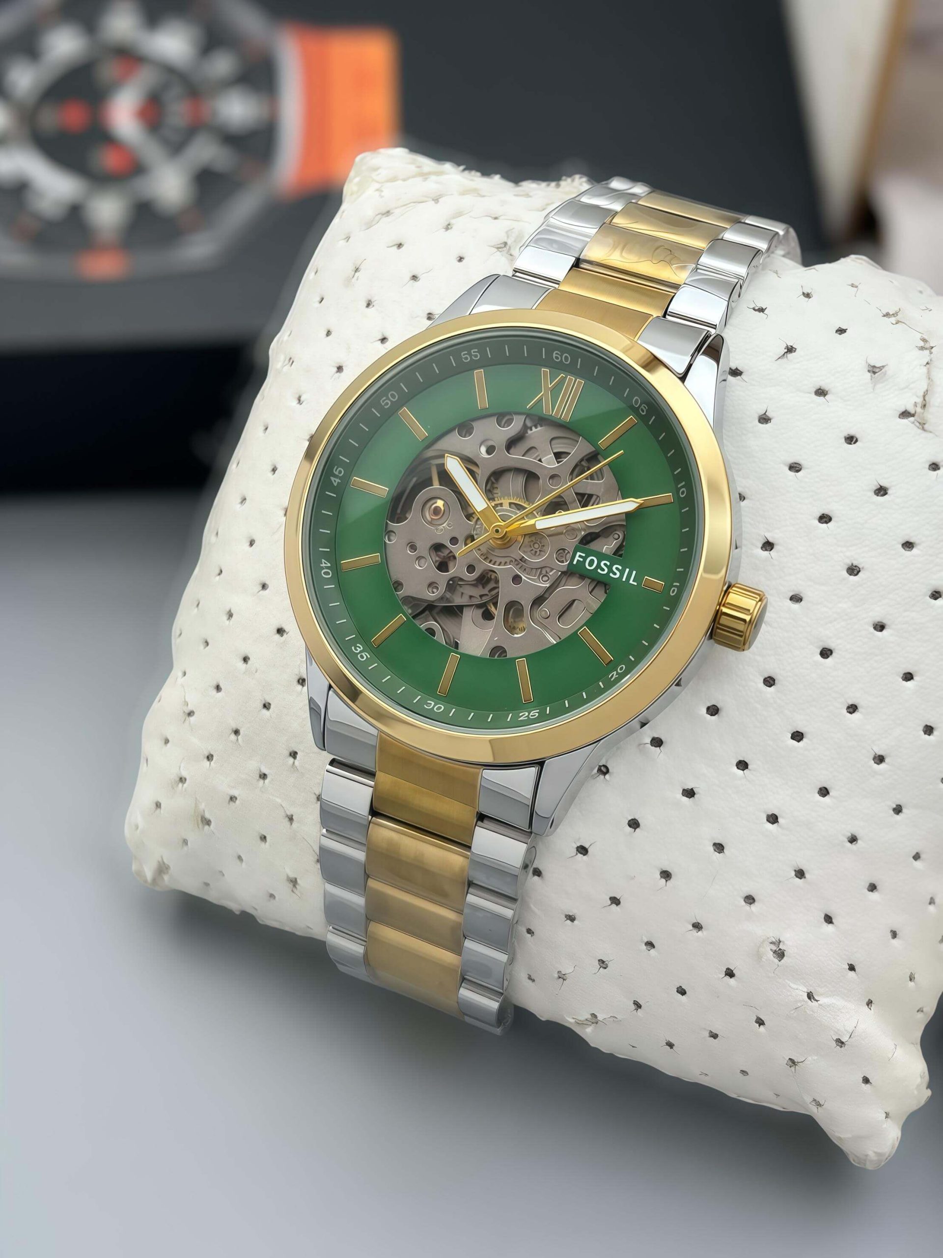 Experience luxury with this stunning Fossil premium automatic timepiece, featuring a bold open-heart skeleton dial that beautifully showcases its automatic movement. The dual-tone gold & silver stainless-steel strap gives it an elegant and premium look—perfect for everyday wear or formal occasions.