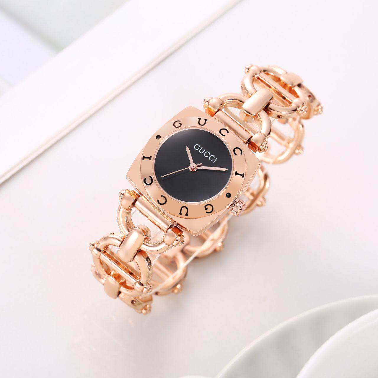 - Premium Design: Features a unique square dial with a rich green face, beautifully contrasted by a rose gold bezel engraved with the iconic Gucci branding.