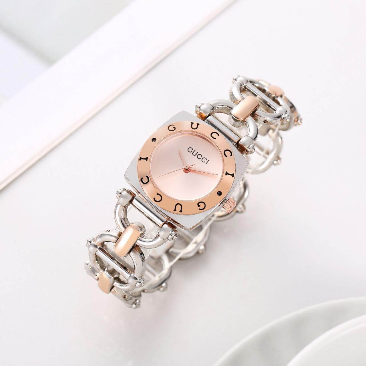 Premium Design: Features a unique square dial with a rich green face, beautifully contrasted by a rose gold bezel engraved with the iconic Gucci branding.